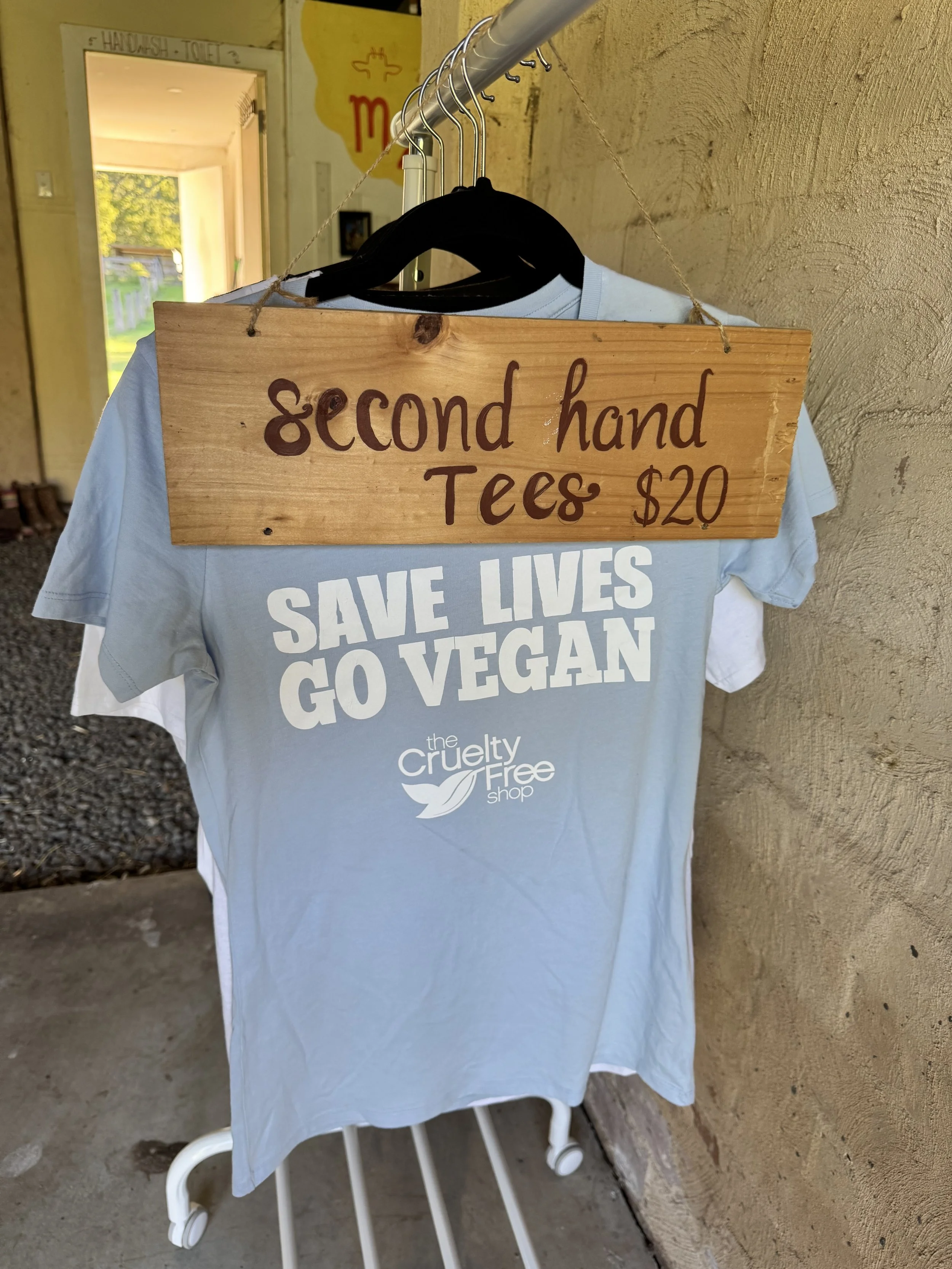 These tees are given a second life at our sanctuary — sell them during tours and events as a gentle, low-waste fundraiser. They move quickly, and every shirt directly supports the animals in our care.
